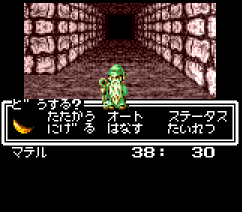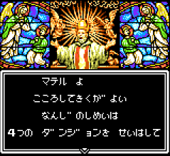 Apparently made by Sega, Last Bible Special was only released for the Game Gear, and is much closer to the Megami Tensei series in terms of gameplay. The dungeons are now first person again, removing it heavily from the other Last Bible games. Instead of the usual historical theme, the setting seems to be in biblical times, with a heavy Christian slant - you're given orders by someone who looks much like a Catholic bishop, and the backgrounds are adorned with ornate stained glass windows. And good lord, do they look good. While the static screenshots may look boring, the scrolling is much smoother than even the Super Famicom games, even if it does move slowly. Considering that the Game Gear is an 8-bit system, this is pretty impressive. Otherwise, it's the typical story - as the hero Matel, you must conquer four dungeons and save the day.