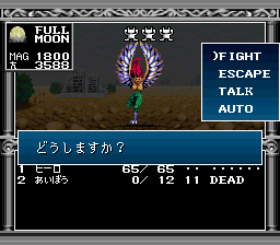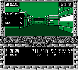 Graphically, Megami Tensei II is far better than the original, although the color choices in some of the dungeons are a bit questionable (your shelter is an eye-punching green), but there's a greater variety in the graphics, with more detailed backgrounds and enemies. While most of the game is still first person, the world map is overhead. There's no scrolling in the first person view, instead using a distracting screen wipe every time you take a step. However, the interface has been revamped a bit, including the introduction of the stick figures in battle that indicate the number and status of enemies. While the difficulty has been toned down a little from the original, occasionally the game will throw some very tough enemies at you in large numbers, making it somewhat unbalanced.