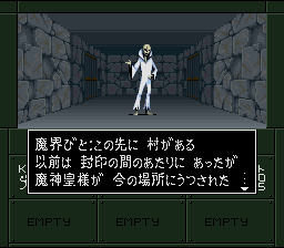 While having nothing to do with the original novels, Namco kept the same play mechanics and took the story in its own unique direction. In the year 199X, nuclear missiles were launched, and civilization as we know was destroyed. Megami Tensei II focuses on two teenagers living in a shelter in this post-apocalyptic world. You begin playing a video game called Devil Buster, which is suspiciously like the original Megami Tensei (with the same location names and music, although with an overhead view). When you beat the first boss, the demon Pazs greets you, grants you with the ability to control demons, and warns of a menace. Soon enough, your shelter is invaded by monsters, and it's up to you, your friend, and whatever allies to can recruit, to venture to the outside world and try to save the wreckage of humanity. In many ways, it's like the Japanese thematic equivalent of American RPGs like Wasteland and its spiritual successor Fallout.