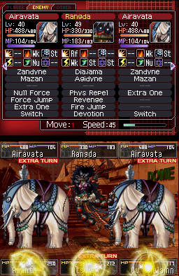 Strange Journey completely eliminates the Press Turn system made famous in the Playstation 2 games. Instead, if a character of a certain alignment hits a weakness, the others in the party of a same alignment will follow up with a powerful physical attack. The more that share the first attacker's alignment, the more powerful the follow up will be. The player also has to fight enemies once to get any information on them. On the first encounter, they appear as formless data. Fighting them more often reveals more about the demon, which is displayed on the lower screen, and hitting their weaknesses speeds up the process.
