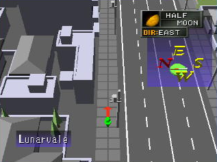 This being an early PlayStation game, you'll encounter constant loading times. And since rooms are no longer identified before you enter them, you’ll often waste time running in and our doors. The city has been expanded beyond a small map screen, and you're given full freedom to explore Lunarvale. Everything is 3D rendered, filled with untextured polygons, and somehow still moves at an incredibly choppy frame rate. While it gives the city a sense of scale, it feels like an unnecessary way to stretch out every segment, because you’ll be running back and forth across town a lot.