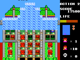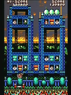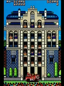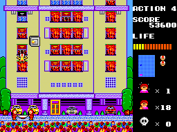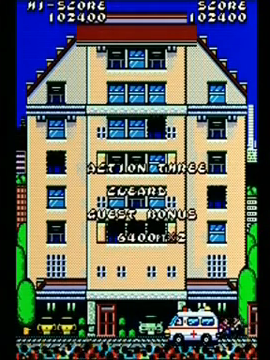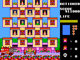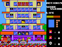After latching onto a window, you can press the button again to make the fireman let go and fall straight down, but he’ll also eventually drop on his own. Grabbing a window that has a fire in it will put that fire out, and grabbing a window occupied by an inhabitant will cause the fireman to bring them down with him to be rescued. If there’s more than one being in a window, another one will appear immediately after you drop down. All the mat jumping and window grabbing will slowly decrease your life meter. If the meter fully depletes, our bouncy buddy will be consumed in flames and lose a life. Falling to the ground without landing on the mat will also result in a lost life. If all your lives are spent, it’s game over and back to the title screen; however. if you hit start quickly enough, you can start over on the last stage you died on. Otherwise, the game will start back on Action 1. If the building is emptied of all inhabitants, the fire truck will return and fire a missile in the air which somehow eradicates the remaining flames, possibly leaving you to wonder, “Couldn’t we have done this earlier?” If you finish without anyone dying, you’ll earn a cool 10000 points on top of your score.