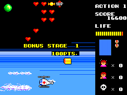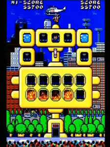 Between the fires and the victims, there are hidden items to be found in the vacant windows and caught with the mat. Usually the items that fall out will be something to increase your score a little bit (coins, moneybags, safe boxes, jewelry), but sometimes you’ll get something more beneficial. A 1UP box will, naturally, give you an extra life, a fire extinguisher will completely replenish your life meter, and the mat upgrade will widen the mat and offer much better control over your fireman as well as provide more coverage for suicide prevention. There are two special items that will instantly end the level. One is a key, which will flood the entire building with water from the top down, and the other is a helicopter that launches a fire-destroying missile just like the fire truck. In addition, grabbing the helicopter will also trigger a bonus stage after the action stage is over. Anyone still inside when the flood occurs won’t be harmed at all, and will be picked up by an ambulance afterward. In fact, anyone remaining in the building is worth double the points they normally are. For scoring purposes, the best strategy is to find the helicopter as quickly as possible without any inhabitants splattering on the pavement. The bonus stage brought by the helicopter will score you even more points and involves catching falling items with said helicopter. Items to catch include money, jewelry, food for health, and occasionally some 1Ups. Catching everything earns you a whopping 30000 bonus points.