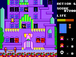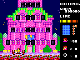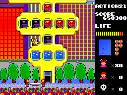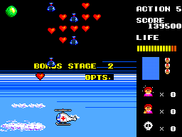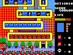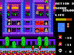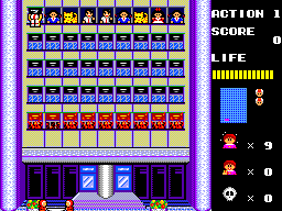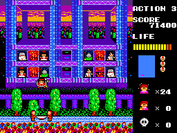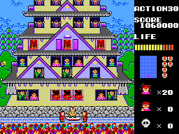 There are a total 30 stages, or “actions” as they’re called in the game, and each one features a different structure filled with civilians and occasionally a cat (which the programmers had the foresight make worth more points than some of the human residents). The right side of the screen contains information such as your score, the fireman’s life meter, a small map showing the position of the fireman and the mat crew, how many victims are in the building, how many have been rescued, and how many have died. The music is catchy and light-hearted, although not what one would imagine given the subject matter. There are three different tracks that will play throughout the course of the game and will alternate every ten actions. Megumi Rescue also makes use of Sega’s FM Sound Unit.