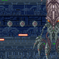 Metal Black‘s graphics are mind-blowing for a game released in 1991. The F1 board, much like the SNES, was built with hardware flexibility in mind, by supporting several expansion chips that augmented its capabilities in multiple ways. Metal Black uses one that adds assorted graphical effects, such as extra layers of scrolling and scaling, and they all work together in brilliant ways, adding life and depth to an otherwise bleak 2D world. The simple, crosshair shooter-esque bonus stages triggered after Stages 1 and 3 not only work as graphical showoffs, but also double as fancy playable cutscenes, as they show the Black Fly blasting off into space and penetrating the alien’s dimension, respectively. The most eye-catching are probably the trippy backgrounds, the Stage 2 boss intro, and the massive, flaming, globe-like explosion that marks the end of each stage.