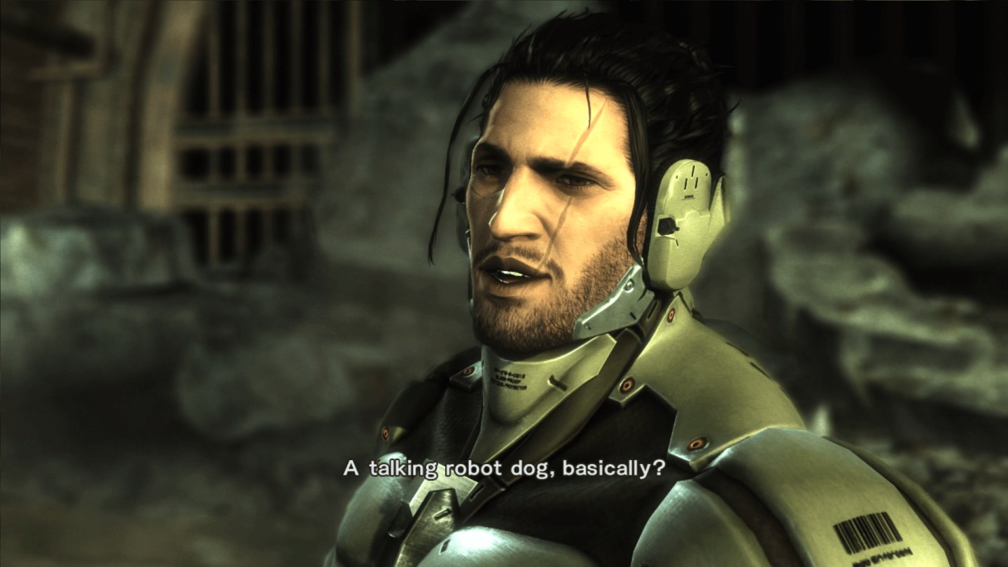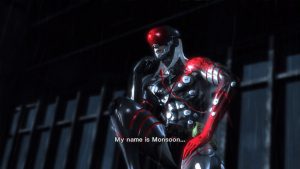 The game looks and performs well. The action is fast and flashy, and the performance is consistent. It takes a lot of visual cues from MGS4, like the sepia-toned look and muted color palette. An impressive amount of the environment can be cut up. This isn’t Red Faction; Raiden can’t literally cut a path through the level, but trees, boxes, cars, and more all react to his sword slash, as they did in the original reveal trailer. Soldiers tumble off a balcony after its supports are knocked out, slicing through missiles is totally a valid strategy, and a tower of boxes convincingly tumble to the ground when the base is attacked. Being as this takes place after the fall of the Patriots, many enemy designs are variations on earlier ones. The little 3 armed Dwarf Geckos return, as goofy looking as ever, along with their more imposing, bipedal counter parts. Cyborg cops attack with giant swords & hammers, and a hulking ape-like creatures with huge cylindrical arms tosses Raiden around when they get a hold of him. Bosses come in some unique designs as well. One boss, Monsoon, has an entirely magnetic body, with individual parts leaping out of the way of Raiden’s blade when he attacks. Another, Mistral, piles on the Dwarf Geckos for armor, plugging their arms together to create her weapon.