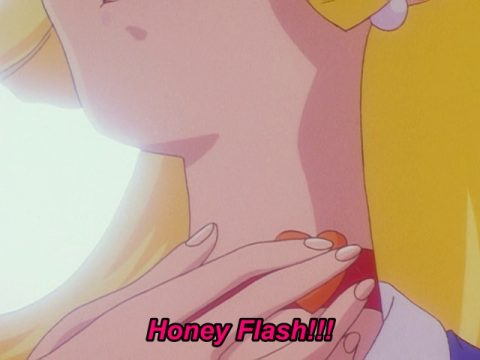 (Note: Cutie Honey Flash was an anime airing in Japan, from 1997 to 1998. The main character in the show transforms into her personas by hitting a button on her choker and saying the phrase ‘Honey Flash.’)
