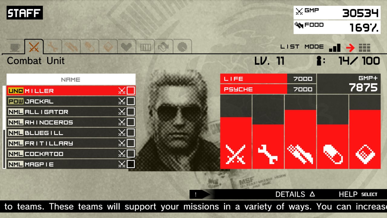 Luckily the game plays well, despite the narrative failings. Peace Walker might be on a pint sized system, but it manges to feel just as large as one of the console entries in the series. This is due to the newly added base management. Mother Base is divided up into different divisions – R&D, mess hall, etc. – and each division needs staff to run. Soldiers have stats related to those divisions and the better staffed a division is, with soldiers who are qualified for it, the more efficient it is. This incentives replaying stages to kidnap combatants who are more adept in the areas where the base is deficient. Folks on the base can get into fights or get wounded, requiring a stop at the brig or the infirmary. Snake can also send soldiers and machines out on missions while he’s busy with his own, like Portable Ops, and players even get to build and customize their own Metal Gear, as well. This base does require attention, so for those who just want the stealth action, it can be a nuisance to constantly have to skip through notices and manage it.