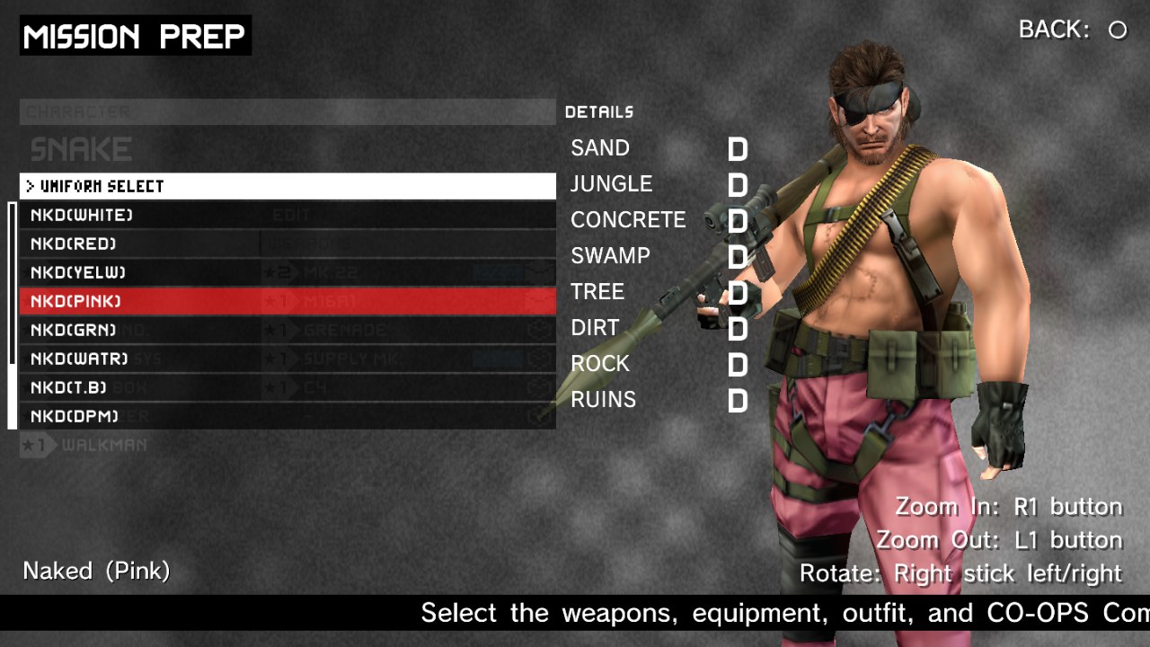 This ironically means that Peace Walker feels overwhelming in terms of content, not story, especially for those wanting to complete everything. There’s a lot of missions to work through, lots of weapons, items, & mechs to build, and the final true mission has several elaborate, grindy requirements. It works best in short bursts or with friends, especially on bosses which were designed for groups rather than solo play. Any given stage never feel too long, the game telegraphs what to expect from any mission, and even the smallest amount of progress feeds into resources for unlocking new gear. Each mission starts with a planning stage, where players get to choose a load out. Camouflage returns as part of mission planning, allowing players to chose an outfit they think best matches the challenge before them. With all the items and weapons to unlock, it can be fun to return to an earlier mission with new toys.