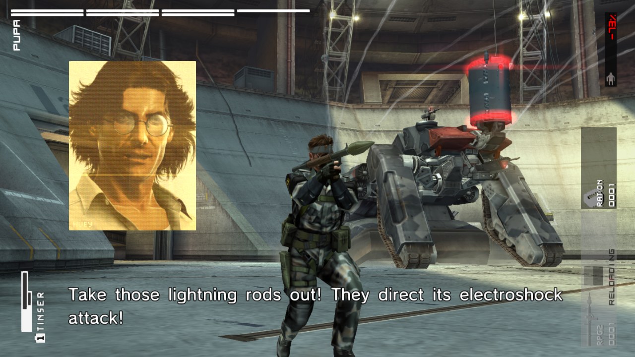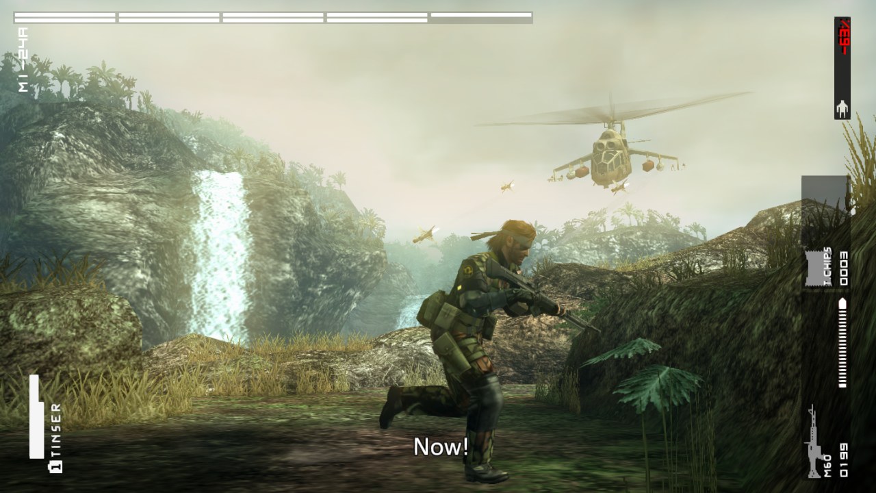 While Peace Walker bills itself as a sneaking mission, many missions and boss fights encourage a more direct, action-based approach. Kojima Productions were inspired by Capcom’s Monster Hunter series, something especially evident in the bosses. They have weak points, like fuel tanks or machine guns, that can be exploited or destroyed with good aim, involving strategy, resources, and time to overcome. Camo is still present but Snake can’t change his outfit during the mission, having to choose wisely during planning. Perhaps due to being designed for a portable format from the start, auto aim is just a bit too generous. The PSP was more limited than its console brethren in the control department, but even on the HD ports, Snake pops off super accurately. Luckily, it can be toggled off. Peace Walker’s enemies adapt to Snake’s weapon choices. Enemies will start bringing helmets or blast shields for players using lots of headshots or explosives.