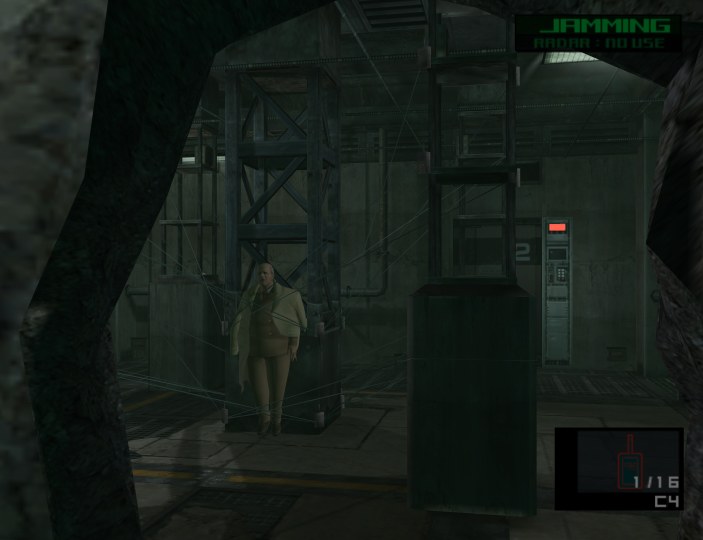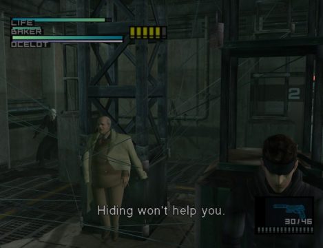 Upgrading the original’s cinematics wasn’t the only change in The Twin Snakes. The mechanics are polished up to the same level as Metal Gear Solid 2. Enemy AI is enhanced, with soldiers coordinating and breaking out riot shields during caution & alert phases. Snake can shoot out radios and hold up his enemies. These upgraded mechanics help make the experience feel more modern, but they also feel superfluous, since the game isn’t substantially altered to take advantage of the new actions. Lockers are scattered around Shadow Moses Island, but it’s not like there’s compelling reason to hide bodies, given that the setting is broken up into smaller rooms than its sequel. Hanging and climbing were added as well, but outside of finding a couple of shortcuts to speed up some of the late-game backtracking, it could have just as well not been added. The new mechanics actually break the game in places. Ocelot’s boss fight is a cakewalk, with first person aiming defeating the already contrived purpose of the room it takes place in.
