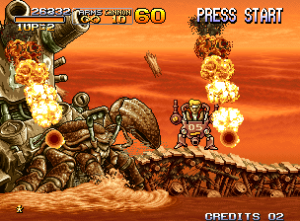 Both of these ports feature two extra mini-scenarios once you complete it. “Storming the UFO Mothership” sets the stage in the final level puts you in control of one of three enemy soldiers – a “Normal” guy, a “Bazooka” guy, and a “Shield” guy. As you plow forward, a whole army of Morden’s soldiers will tag along and start killing enemies along with you. You can also call Sgt. Allen O’Neill to help clear the screen. “Fat Island” is a two player game where each compete to eat as much food as possible.