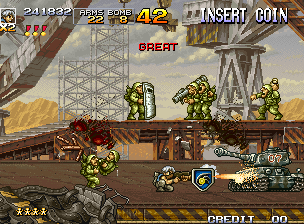 The only real standout element of Metal Slug 4 is the soundtrack. The music is a pretty big departure, as it sounds nothing like the previous games, aside from the “mission complete” jingle. It’s all composed by Toshikazu Tanaka, who also worked on other titles like Rage of the Dragons and Matrimelee, and has since become one of SNK’s most prolific and talented composers. It features a unique blend of guitar-based rock and synth orchestrations, most with very catchy melodies.