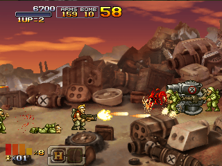 So while it does make good on its titular promise to play like a true Metal Slug game, the quality of said game is a bit more questionable. The series stumbled with the fourth and fifth installments, but the additions to the sixth game were very much welcomed. Unfortunately, the designers have fallen back into the same rut. It carries forward all of the features from Metal Slug 6, including all six characters, their special abilities, and the scoring system.
