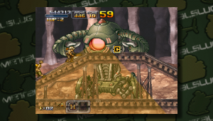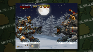 It does not, however, add much of anything else. There are seven levels – one more than a usual Metal Slug game – but they’re mostly dull retreads of everything we’ve seen before. Once again, the backgrounds have that rendered look that looks amazingly dull compared to the beautiful pixel art of the earlier games, and so much of the game takes place in mines and underground caverns that it feels way too dark. The new enemies include metal suit wearing Morden soldiers from an alternate dimension that appears to have emerged out of a Stargate, but this doesn’t make for any particularly interesting encounters. Some of the boss fights use impressive multi segmented sprites that animated separately through rotation effects, which are the few areas that are somewhat impressive. The sixth stage puts you in control a gigantic mech, stumbling forward and smashing over enemies, before challenging Colonel Allen mano-a-mano in a similar machine. The other interesting stage gives you a parachute, slowing your descent as you fall off cliffs into an enemy stronghold. There’s a new weapon that shoots out lightning, but even the Slugs here are pretty boring.