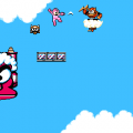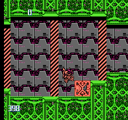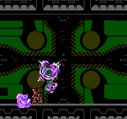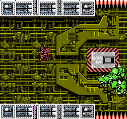 Naturally, as in any other NES actioner, there are several power-ups you can grab to help you on your mission, such as the “A” icon which provides an additional armor point and prevents you from immediately dying after a hit. “B” gives over 5000 extra points, “T” adds 100 seconds bonus time, and “C” obliterates all enemies on the screen. Three particularly important power-ups provide the M-308 with enhanced abilities, but only one of these can be active at any time. The most practical of these three is the “P” icon which upgrades your weapon to do more damage and penetrate through most solid surfaces. The “S” icon generates an energy shield in front of your gunner that deflects most bullets, although larger projectiles can break through it. The “G” icon turns the M-308 into a destructive fireball every time it switches gravity, useful for taking out pesky enemies who take advantage of the swap. Rare spots even contain 1-ups, although you will usually have to work and jump out of your way in order to get anywhere near these.