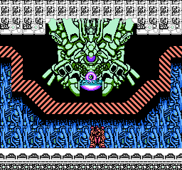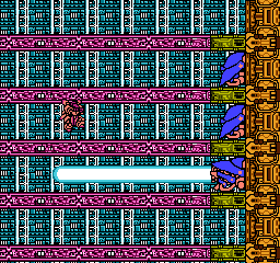 Irem often includes fascinating and/or innovative boss fights, and Metal Storm offers some tricky end-of-stage challenges which require you to think fast or fail. Nearly every boss battle demands appropriate use of your gravity-flipping abilities in order to survive, such as the first battle, an impressive giant of a machine with a weakspot which shift between three different points. You can only reliably attack two of these points while upside-down and you have to avoid ring projectiles while staying on offense. Later bosses include a wall of fluidly-animated laser turrets which force you to keep jumping or be vaporized, a floating mech with deadly satellites and crossing beams effectively dividing the room into quarters, a red robot that bounces around the aforementioned cage while two support robots attempt to zap you from above and below, and a very impressive transforming mech which has three different forms that fire different types of beams at you. The worst of the lot is the penultimate fight against three blocky platform robots whom you must destroy while also not falling off of them onto a perpetual laser surface which will vaporize you.