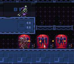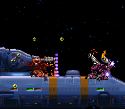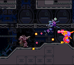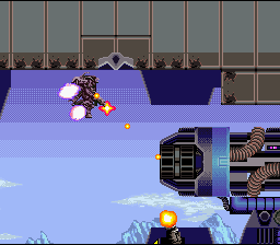 Your mech controls similarly to Cybernator, although there’s no way to lock weapon aiming (your aim resets to default once you move), the dash ability is completely gone, guns no longer need to reload, and the weaponry system is entirely different. There are now a total of six different mechs, each with three types of attacks, mapped to the various face buttons. Your primary mech, the Nitro, has a rapid fire pulse rifle, a beam sword, and unlimited hovering ability while the Havoc has a similar machine gun and a cool looking sickle, but can’t fly as long nor as far. From there, the other mechs get a bit stranger. The Drache has unlimited flight ability and can fire in any direction with the face buttons. The Prometheus is a two legged mech that can’t jump, but has an extremely powerful cannon and a flamethrower, as well as the ability to toss up floating air mines. The Ballistic is basically a stationary turret that only moves by turning itself into a ball (which can also be charged up to dash around the screen and damage enemies), while the Spider has many smaller legs like an arachnid and can climb up walls.