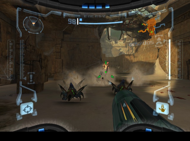 A few other first-person shooters of the time attempted platforming, like the planet Xen at the end of Half-Life, and no one had anything nice to say about them. Metroid Prime, again, tries something different in making platforming a significant part of the experience, since it was so intrinsic to the 2D games. Samus’ movement is keenly attuned to allow you to easily jump from platform to platform, moving at a speed that’s easy to control and helpfully tilting her head slightly downwards in mid-jump. It’s a little tough to get a hold of at first, since, unlike other 3D games, you can’t use a shadow to approximate where you’ll land, but the landscapes are also constructed to make it as easy as possible. You also get the Space Jump early on in the game, which effectively acts as a double jump in the Prime series, making traversal almost effortless. There’s even a little gauge on the visor which detects the proximity of environmental hazards.
