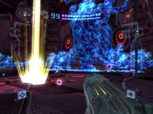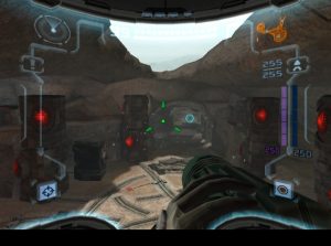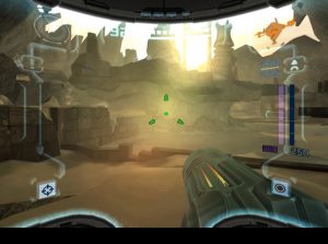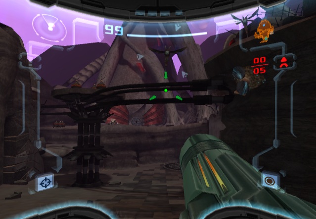 While the Dark world elements are Metroid Prime 2‘s biggest strengths, they’re also one of its biggest weaknesses. The original Metroid Prime was so effective because it was such a gorgeous game, presenting an alien world that was dangerous but fascinating. In contrast, Metroid Prime 2 is just unrelenting brutality. The hub area of the Temple Grounds show off some cool designs, but the Agon Wastes consist of little more than sand and rocks, while the Torvus Bog is one gigantic green swamp. Toss in the purple shades of the Dark Aether, and so much of the game just looks and feels gloomy. At least this is somewhat rectified by the Sanctuary Fortress, a citadel filled with high technology and a bright silver, retro sci-fi aesthetic. It also contains one of the coolest enemies in the game, a virus that infects Samus’ suit and can only be defeated by rebooting, executed via a button function.
