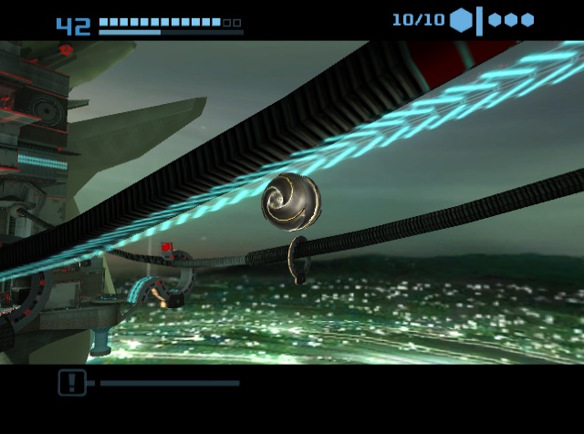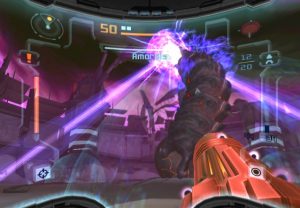 The original Metroid Prime was missing the Screw Attack, as the developers couldn’t quite figure out how to make it work in 3D. They’ve solved that problem here, though functionally it’s also similar to the Space Jump from Super Metroid, allowing you to bounce mid-air several times, as well as spring off of certain types of walls. Like the Morph Ball, it’s a lot of fun to use, though it doesn’t shred through enemies quite as well as in the 2D games. There are also new types of visors: the Dark Visor lets you see objects that are stuck between the two dimensions, and the Echo Visor, which lets you see sound waves. Both of these are used in boss battles and some puzzles.