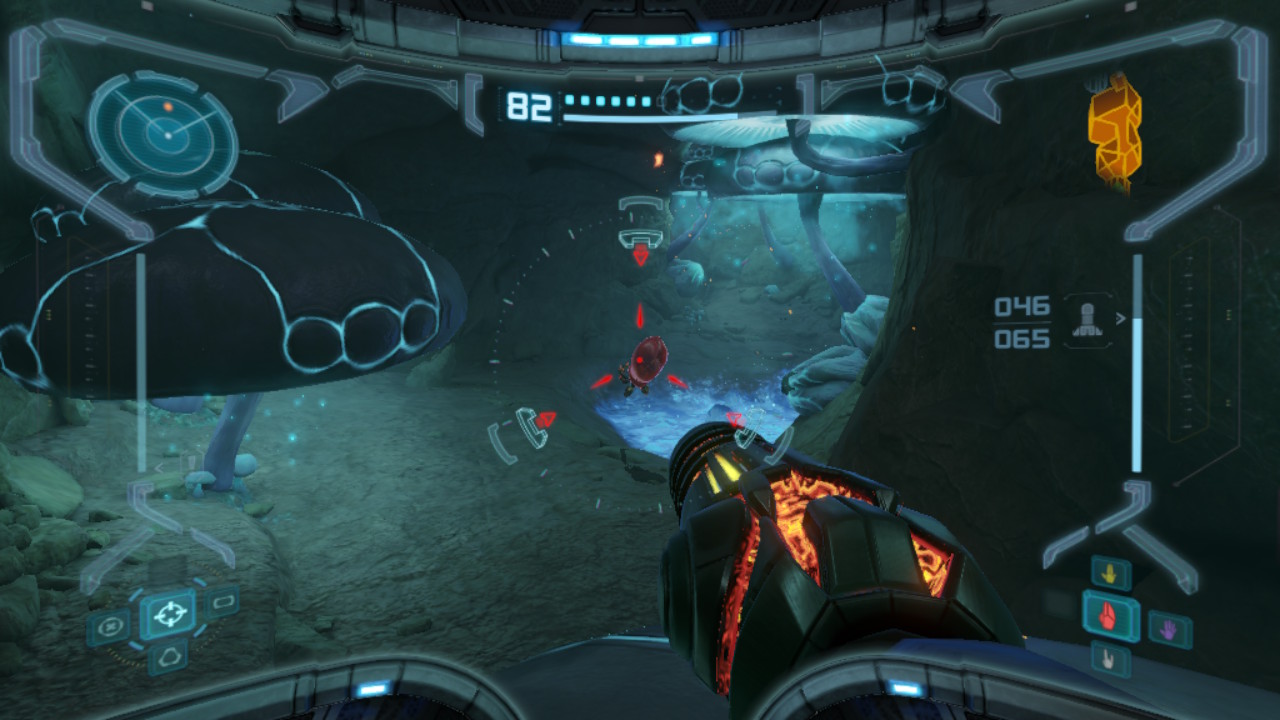 The 2009 version featured on the Metroid Prime Trilogy release instead features Wii Remote controls, giving you a more traditional control scheme that lets you move and look around independently. However, the lock-on function is still available and used in many fights, since the combat was originally designed around it. Even though the Wii supports GameCube controllers, you have to use the Wii Remote control scheme if you’re playing this version. The Remastered version on the Switch offers a standard FPS dual-stick control scheme.