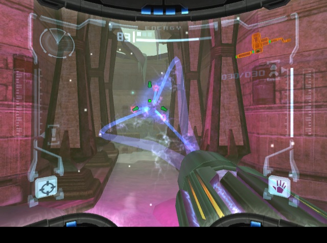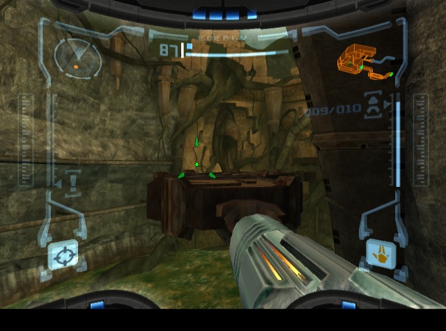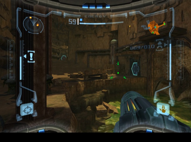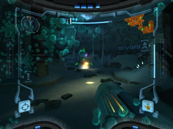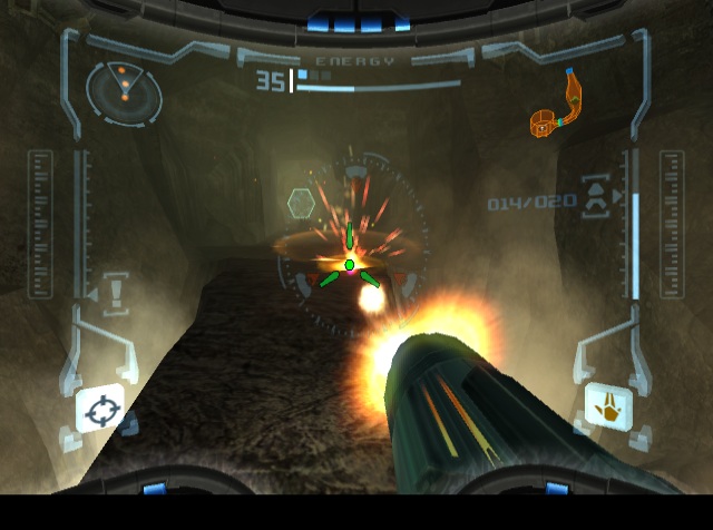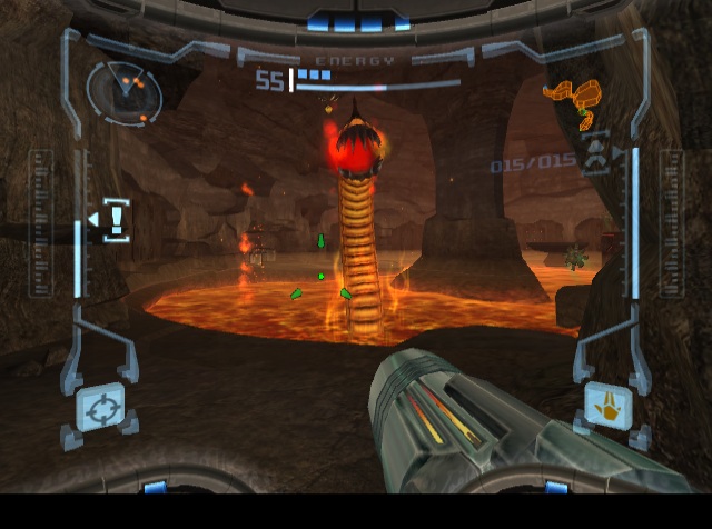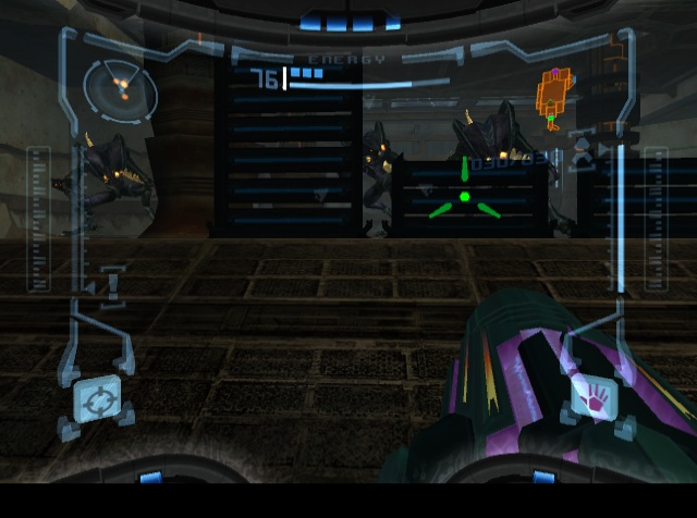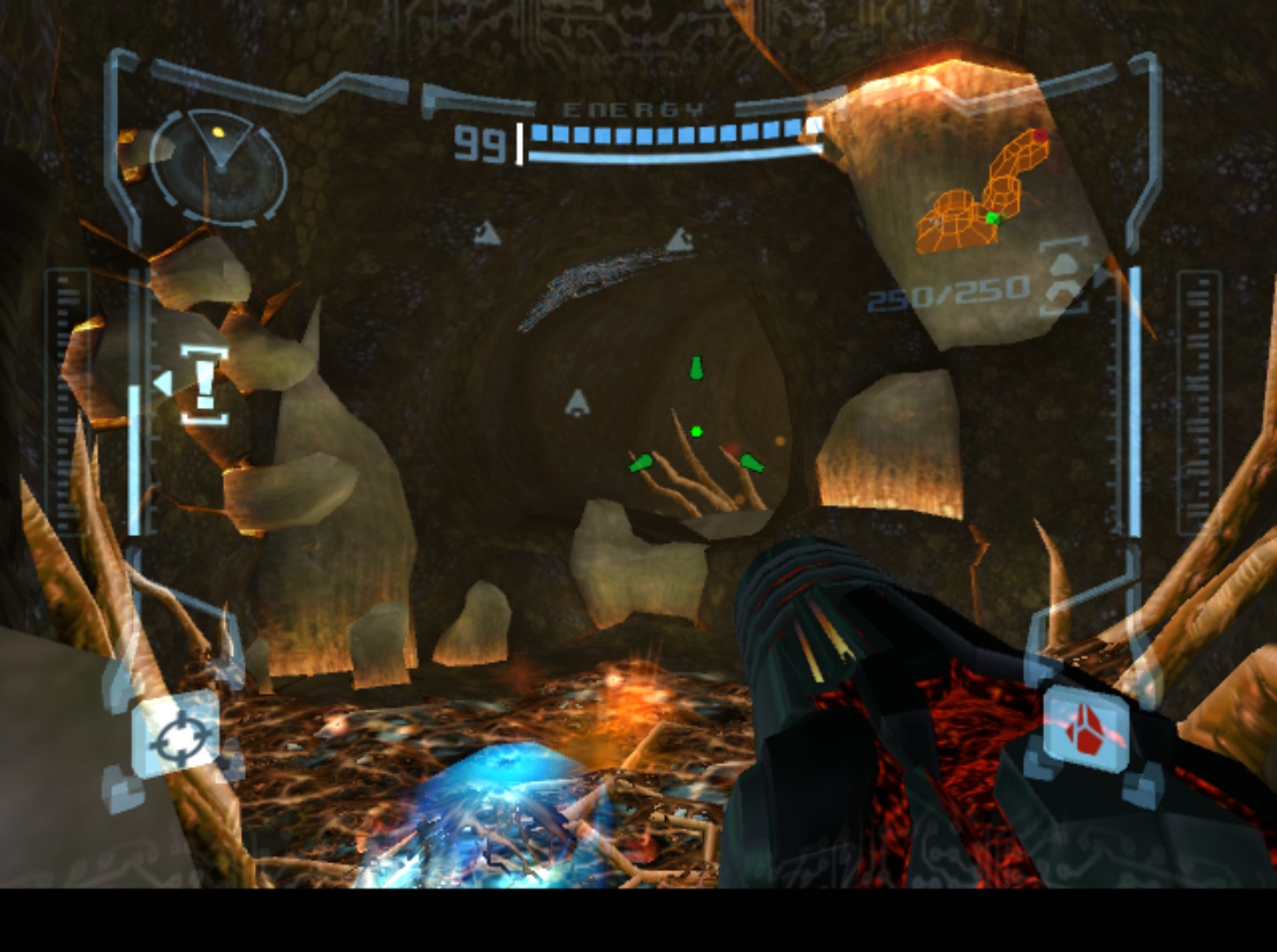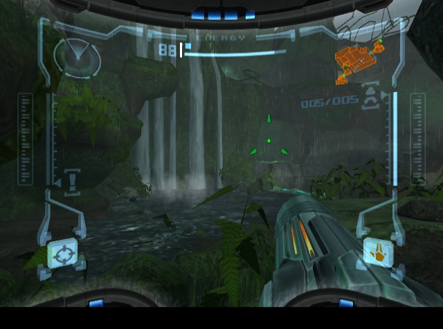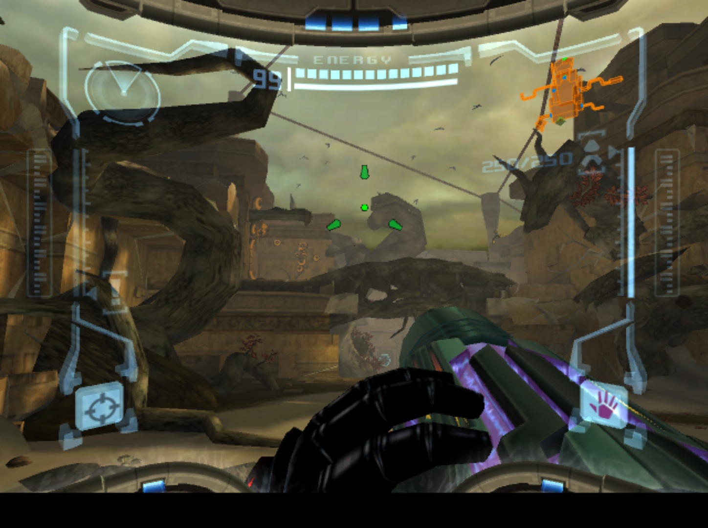A few other first-person shooters of the time attempted platforming, like the planet Xen at the end of Half-Life, and no one had anything nice to say about them. Metroid Prime, again, tries something different in making platforming a significant part of the experience, since it was so intrinsic to the 2D games. Samus’ movement is keenly attuned to allow you to easily jump from platform to platform, moving at a speed that’s easy to control and helpfully tilting her head slightly downwards in mid-jump. It’s a little tough to get a hold of at first, since, unlike other 3D games, you can’t use a shadow to approximate where you’ll land, but the landscapes are also constructed to make it as easy as possible. You also get the Space Jump early on in the game, which effectively acts as a double jump in the Prime series, making traversal almost effortless. There’s even a little gauge on the visor which detects the proximity of environmental hazards.
