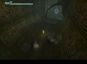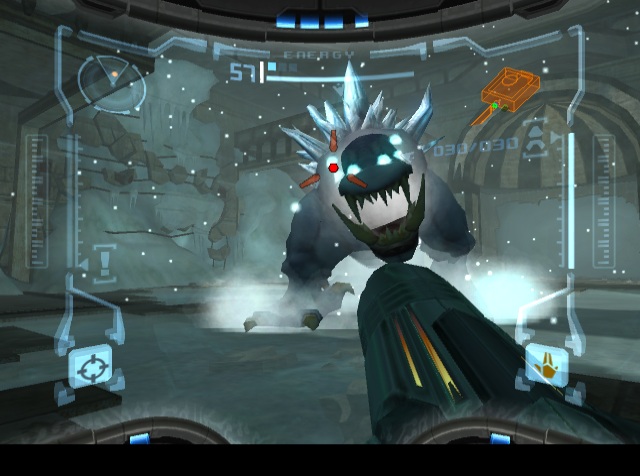 Nintendo and Retro were keen to address some of the regular issues with first-person shooters of the era. Primarily, in many of these games, it doesn’t really feel like you’re controlling an actual character, but rather just a floating gun. To that end, Metroid Prime works overtime to make it feel like you are truly inhabiting the Power Suit of intergalactic bounty hunter Samus Aran. The perspective here includes her visor, which displays the health meter, a missile gauge, a radar, and a minimap. Not only is it a clever bit of UI design, but it’s also incredibly immersive – the visor mists up when you approach steam or water, and bits of alien goo will splatter on it if you kill an enemy up close.