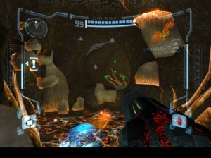 Chronologically, the Metroid Prime series takes place between the first and second Metroid games. The first entry begins similarly to Super Metroid, with Samus answering the distress signal of a vessel orbiting the planet Tallon IV. This opening segment acts as both a prologue and a tutorial, allowing the player to accommodate themselves with the new first-person perspective and controls. Once again there’s an encounter with Ridley, now taking on a cybernetic form, and once again, the ship begins to self-destruct as Samus tries to escape. She takes some damage in the process, removing many of the special abilities of her suit (providing an in-game explanation as to why she keeps losing her powers and must regain them). Upon reaching her ship, she chases Ridley to the surface of Tallon IV and begins her search.