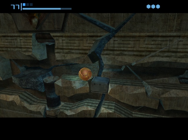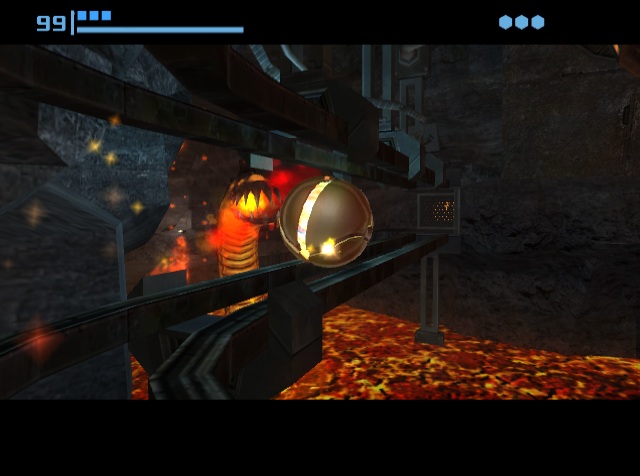 Easily the most fun of the upgrades is the Morph Ball. It was always a weird and unusual function in the 2D Metroid games, but here, the physics are completely different from when you’re walking about, and it’s a lot of fun to just roll around the scenery. There are also a few half-pipes where you can use the Boost function to build up momentum as you roll back and forth, eventually propelling you to greater heights. The Spider Ball from Metroid II returns as well, though it’s only usable on specific tracks, rather than just latching onto any surface. There are plenty of little mazes that are presented from a side-view perspective too, and it’s fun to see the way the tracks and tunnels twist all over.