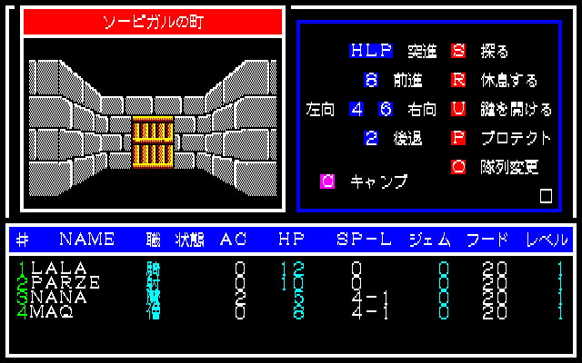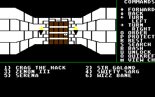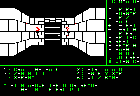 Being a mid-80s home computer product, the game is light on graphics and sound. There is very little music; only a musical ditty on the title screen and a small fanfare when enemies are defeated. When navigating the environment you can recognize the labyrinthine walls of the area you’re in by their flat textures, whether it’s a town, dungeon, or forest. NPCs and monsters have their portrait displayed when you encounter them. After combat has begun, however, the game switches to a text only screen where the fight is managed.