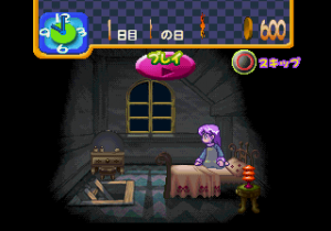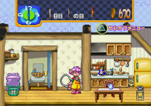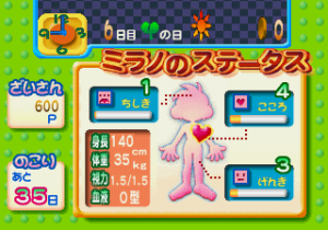 The summer break is 40 days long. You have some free time every day, during which you can study, watch TV, do chores, feed your pet and so forth. At night before bed, you can peruse the mail order catalog for stuff to buy, read a book, or stargaze out your window. Your activities influence Milano’s statistics, which include Intelligence, Heart, and Happiness – these, combined with the weather on a particular day, determine which kind of jobs you can be hired for. There are eight jobs altogether – you can milk cows at a ranch, catch falling fruit at an orchard, wash dishes at a Chinese restaurant, deliver pizzas while riding on a scooter, serve customers at a fast food restaurant, make cakes at a bakery, work in a hospital curing patients, and perform songs at a concert. Alternatively, you can also just spend your dat off relaxing, eating popcorn and people watching at the park. Harder difficulty levels pay more money, plus your performance determines your salary, as well. You can use the money you’ve earned to buy new furniture for your little house and decorate it as you see fit, or purchase new recipes to cook food for yourself.