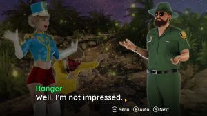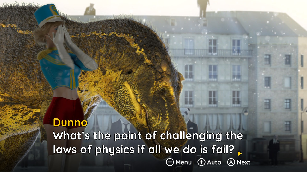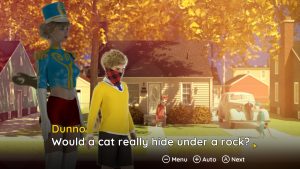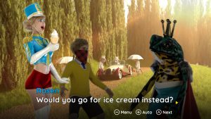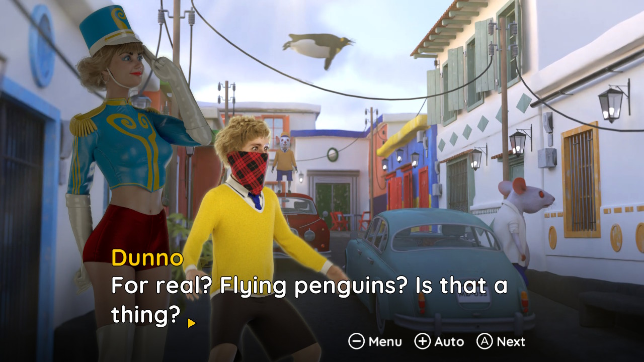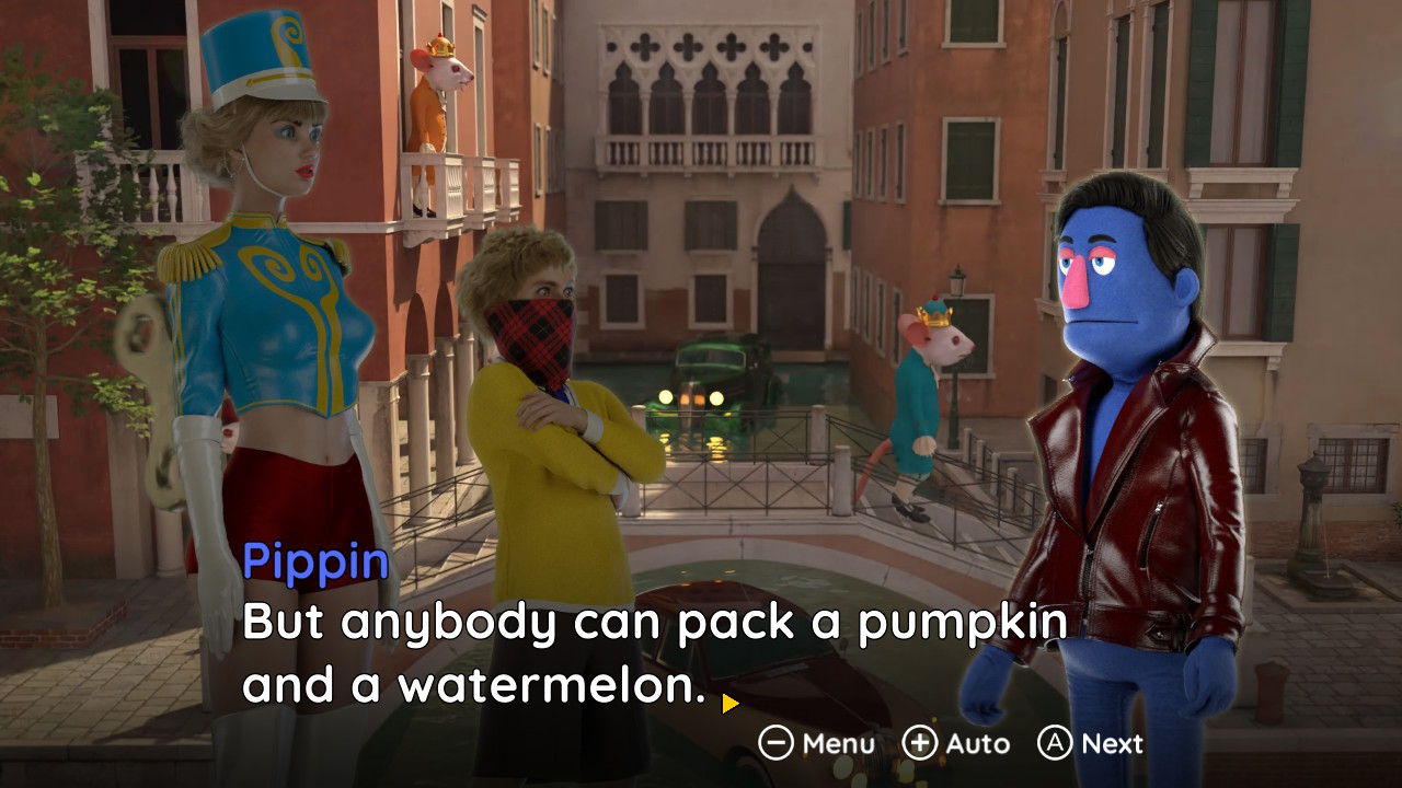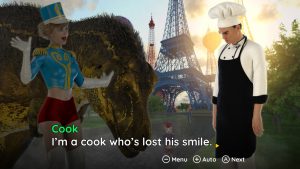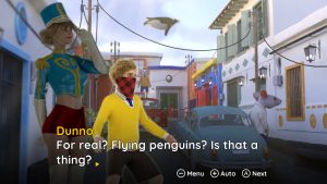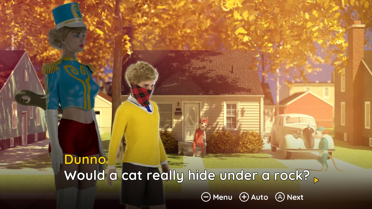 Although the writing is more one-note than About An Elf, keeping to a light-hearted goofy tone that can veer into “lol so random” territory, it’s still a cute game. You’ll run into endearing oddballs, there’s a few running gags that become funnier through their insistent repetition, and a lot of the conversations are quite chuckleworthy. This is accentuated by the ridiculous character animations, where people pull the stupidest expressions and jitter about frantically in front of bizarre backgrounds populated by fancily dressed mice. The music also coins the mood with various tunes backed by upbeat marching rhythms with a heavy focus on brass instruments, like a marching band is performing them off-screen.