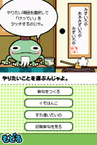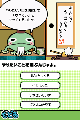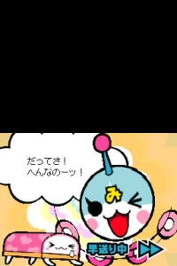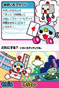 Mizuiro-chan is an adorable round robot with something of a foul mouth, attending her studies at Blood University. You spend a year with her as she attends classes for a year and chases after her love interest, Kato-kun. While linked together with animated cutscenes, the interactive portion of Mizuiro Blood takes the form of various minigames, mostly focusing on Japanese language or rhythm games, all requiring using the stylus and the touch screen.