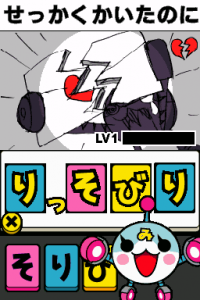 While the visuals are all incredibly cutesy – the art is suppled by Yukiko Yoko, well known for the Taiko Drum Master series, and the designs are incredibly similar – it has a ridiculous dark streak to it, as Mizuiro-chan is brutally killed after failing. Since she’s an immortal robot, she always ends up okay in the next screen, but the parts where she’s sliced, stabbed, or crushed, as blue blood splatters all over, are hilariously violent, especially considered the all-ages CERO A rating. (“Mizuiro” translated to “blue blood” – it’s technically supposed to be oil, though within the context of the game, it’s also poisonous.) In fact, even during the regular story scenes, her or other characters might be casually murdered, and the games continues on as if it doesn’t really matter. There’s a reason why Namco called this a “Instant Death Nonsense Romantic Comedy”. The text on the cover also reads “Comical – Sentimental – Death Metal”.