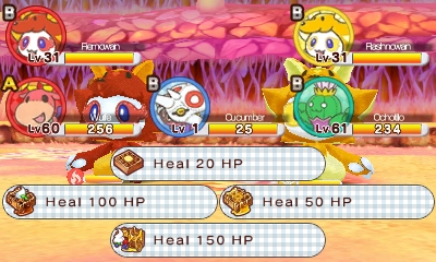 Plushkin battles are 3-on-3 turn-based affairs, and each Plushkin has four moves available to it: a simple attack, and three spells, which can be changed out as the Plushkin levels up and evolves. The spell list in the game is as back-to-basics as an RPG spell list can get, and consists of six elemental attack spells for each element, a handful of healing spells, and a smattering of support effects that almost always hit the entire battlefield at once. Spells are cast from an MP pool shared by the whole party, which refills a little every turn but which also has a strict maximum amount. And every now and then, Moco will go into “Moco Fever” mode, which allows you to spend unlimited MP that turn.