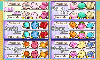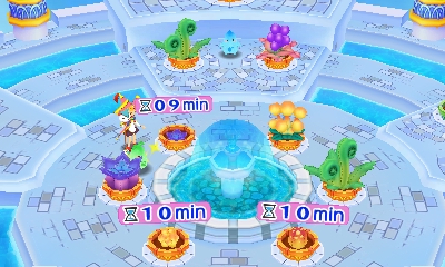 Moco Moco Friends is a dungeon-crawling RPG cut down to its bare fundamentals in an attempt to make it easy to digest for the younger crowd. The hub town is composed of just two screens: A central plaza containing all of the shops and utilities necessary for the game, right down to a handful of NPCs who dispense randomly generated sidequests, and a garden off to the side where items can be grown in real time. The dungeons themselves are equally barebones affairs. While there are a wide range of dungeon areas to visit, several of which are optional, they differ only in appearance, items, and enemies. Each dungeon consists of two simple, mazelike floors and a boss. No obstacles, no puzzles, just occasional treasure chests and item gathering spots. Only the final dungeon mixes it up at all, and it has a whopping three mazelike floors before it throws you at the final boss.
