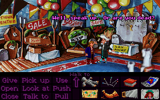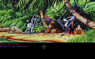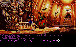 By this point, LucasArts realized that some of their puzzles were a bit too bizarre. To compensate, there are two difficulty levels: Normal (“for video game reviewers”, claims the packaging) and Hard. The storyline and events are the same for each, but Hard mode is substantially more elaborate and takes quite a bit more brainwork to solve. It’s not unnaturally difficult, about on the same level as the first game. On the other hand, the Normal mode cuts out so many puzzles that it’s almost stupidly easy. For example, one of the map pieces is in an antique store. In Hard mode, you need to trade for it with an artifact from a sunken galleon, which starts off a whole big chain of events. In Normal mode, you just buy it outright.