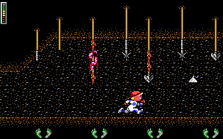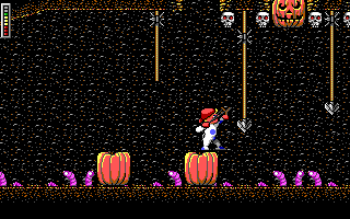 The presentation helps to make up for the game’s issues as well, if only a little. The Halloween theme is clear and present throughout the game, especially where the gore content is concerned. There’s a uprising amount of blood, as enemies bleed and explode into gibs when shot at, and you’ll frequently find guts wrapped around the copious amounts of spikes you’ll find. Thankfully, none of this violence befalls the young hero himself, which keeps it just on the right side between “spooky” and “uncomfortable”. Even burdened with a 16 color pallete, the sprites are colorful, reasonably large, and varied. Unfortunately, the same can’t be said for the backgrounds, and you’ll often spend just a little too long staring at a brown dirt wall. The copious use of digitzed samples adds a lot to the presentation, and are best used instead of the PC speaker effects if at all possible. The music, while not amazing, remains thematically appropriate, and the Adlib cover of Bobby Pickett’s ‘Monster Mash’ is fun to listen to.