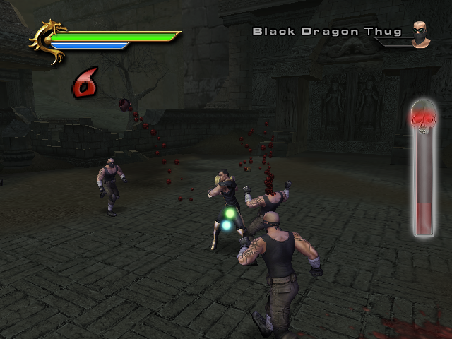 Taven starts off with a decent variety of moves, like being able to do a quick three-hit punch combo, a roundhouse kick that knocks enemies away from him, a throw, and a few moves that launch opponents into the air so he can juggle them. Over the course of the Konquest mode, you’ll also unlock new special moves that can be used against the basic mooks, like a firey ground pound and a projectile. These special moves tend to do a lot of damage, but they’re limited by a meter that gets recharged when Taven lands hits on enemies. Sometimes enemies may get dizzied, giving Taven the opportunity to do a Fatality on them and recharge his special meter. These aren’t anything special, though, just quick finishers like uppercutting an enemy’s head off or impaling them on Taven’s fist. Every once in a while, you’ll also come across weapons that you can use in a certain area, like a hammer that smashes enemies into a red paste with a single blow, or a light saber.