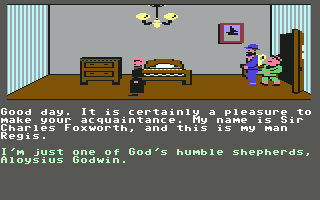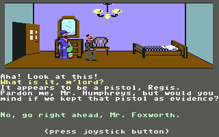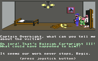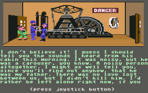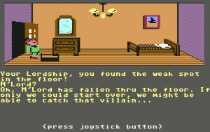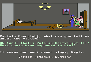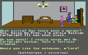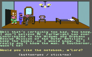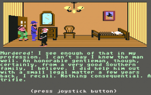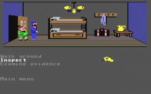 This relatively progressive game was one of the first adventures to avoid the text parser of Sierra games for something more intuitive. Charles is controlled with the joystick – press a button and a menu pops up with all possible commands. It’s quite friendly, but it stumbles due to other reasons. Controlling the characters is somewhat slow and clumsy, which isn’t a big deal. But when you’re searching through beds and dressers, it’s not always clear if you’re positioned properly, making it quite possible to miss valuable evidence. Certain rooms have traps which are impossible to avoid unless you know about them beforehand. The pitfall in Room 1, where a hole appears out of nowhere and drops Charles into an infinite darkness, looks particularly silly.