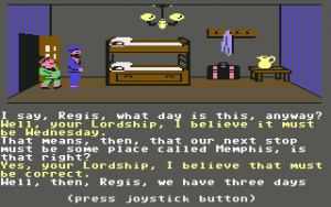 In Activision’s Murder on the Mississippi you control the Sherlock Holmes-esque detective Sir Charles Foxworth, who is sharing a peaceful boat ride from St. Louis to New Orleans with his dumpy pal Regis. Things go awry when a dead body turns up, and Sir Charles is honor bound to find the killer before the boat reaches its destination. There are seven other people on board, all of whom have potential motives, but only one is the true killer. The investigation involves questioning people, searching their rooms for evidence, and eventually building a case against the perpetrator. There are twenty four passenger rooms to explore on two decks of the ship, including the port and starboard side, as well as the captain’s location on the bridge and a few areas down in the engine room. It’s a small but contained game world.