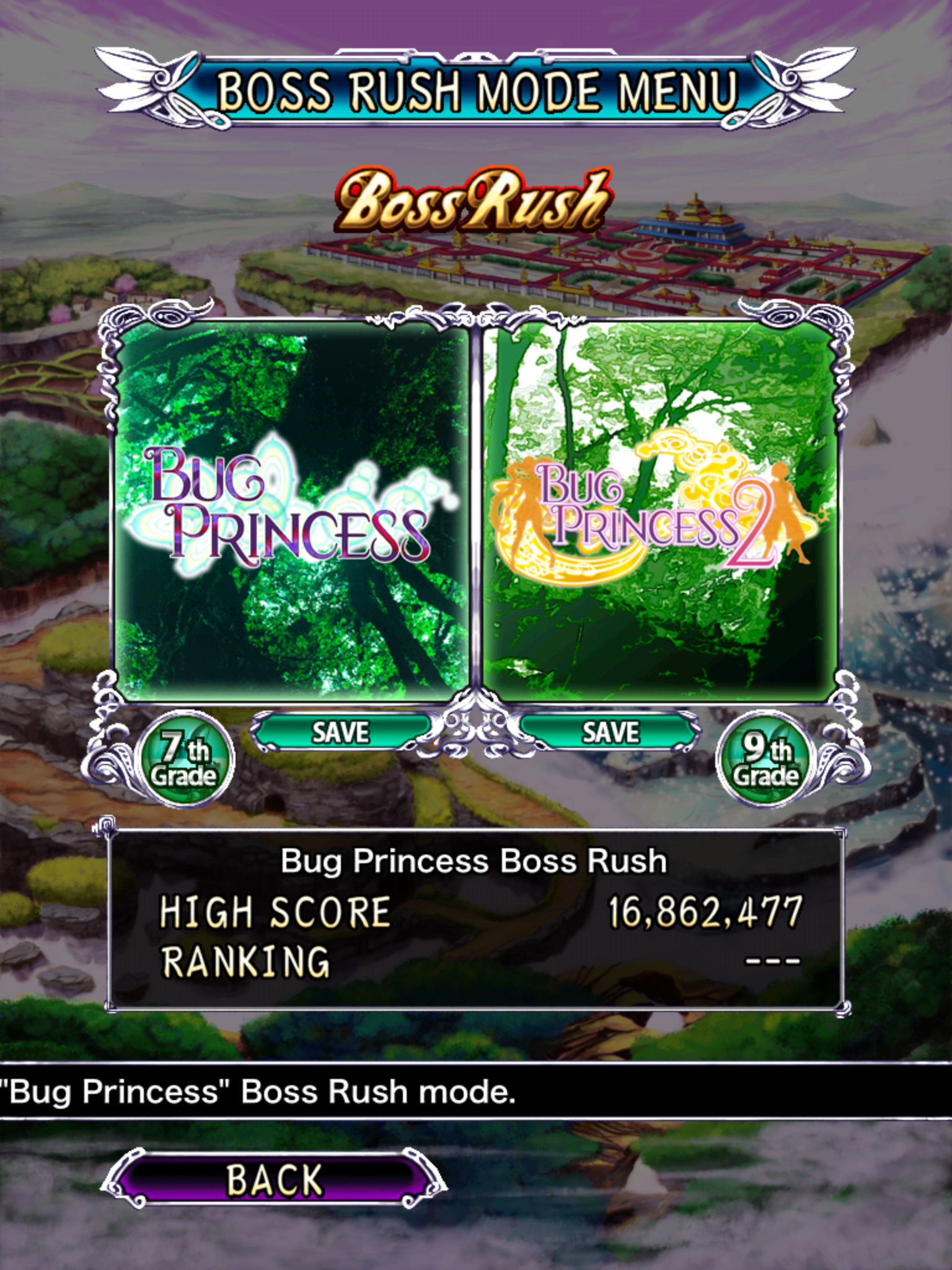 The boss rush mode is treated like a grade (skill) examination, with each successful run resulting in a promotion to the next rank. There are a total of twenty one ranks in boss rush; ten grades, followed by ten dans, and a final rank, Master. Each grade becomes harder than the last, with the 1st grade being set on Original mode, Novice bullet density, and a rank of 0. 2nd grade would still be set in Original, but use bullet densities found in Normal mode. Once at the Dan rankings, they start mixing up the patterns and speeds, which can get really crazy. For example, the 3rd Dan is the Original mode-Hell patterns traveling at Max rank speeds. Then they’ll push it a step further by having those Max rank speeds using the God mode-hell patterns! It can become quite the challenge! During examination, the player’s progress is saved at the start of each boss, allowing players to stop and continue later if need be. After successfully passing an examination, players can go straight to the next rank examination with their current score, lives and bombs, or exit back to the boss rush menu. The game remembers the player’s highest rank, and current progress for Bug Princess and Bug Princess 2 separately from each other. Players can also go back and challenge specific ranks individually, or start from the beginning and try to make it to the end.