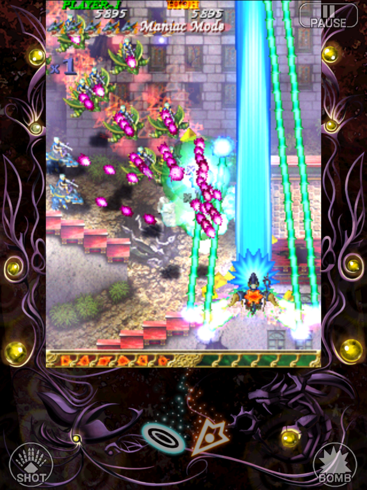 The worldwide release of Bug Princess introduced the Mushihime-sama series to the rapidly expanding market of mobile gaming, while also creating the most accessible version of Mushihime-sama, in terms of both availability and level of difficulty. Thankfully Cave’s Bug Princess sold well enough for them to give the game’s sequel the same treatment as the first game. Bug Princess 2 was released for iOS devices worldwide on April 5, 2012. Although not explicitly mentioned in the title, Bug Princess 2 was ported from Mushihime-sama Futari Ver. 1.5. The main menu interface returns largely unchanged from Bug Princess, having only minimal game-specific alterations. The option formation button has been reworked to switch between the shot and laser buttons, keeping the same method of double-tapping, switching, or holding of the button to activate. Other features such as wait control, leaderboards, all stages, score attack, and training modes are still present, and in the same positions as they were in Bug Princess. This time around, Original, Maniac, and Ultra modes are unlocked by default. Sadly, even though it was released more than a year after the Xbox 360 version of the game with HD visuals, Bug Princess 2 instead uses the original arcade graphics.