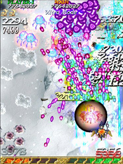 Even though Cave had made the 1.5 revision easier than its predecessor, that doesn’t mean it’s an easy game to beat. Due to (bullet hell) shmups becoming an increasingly niche market because of their hefty challenge, Cave decided to try and expand their audience by creating a “Novice” mode. The goal of Novice mode was to allow more players to experience the joy from triumphing over a difficult challenge on a single credit. Novice mode is the same game as the Xbox 360 version, just with easier bullet patterns, and fewer bullets overall.