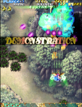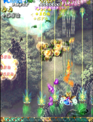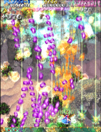 Up until this point, the shmups Cave developed were of the “danmaku” or “bullet curtain” genre, and as such the difficulty in their games being very high. Their games were notoriously unforgiving, often requiring hundreds of hours of practice to master. While their target audience may have reveled in the face of this challenge, most gamers did not, and took their money elsewhere. This caused game designer Tsuneki Ikeda to feel that there was a need in the market for shmup with simpler patterns and fewer bullets. With that in mind, Cave developed Mushihime-sama as a means to go back to their “Toaplan roots”,as Cave was formed by former employees of Toplan.