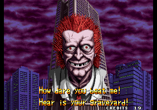 Players take control of Ricky Jones and Johnny Hart. The former is designed to look like a biker, but the latter is way more dated in the best way. Johnny’s bright yellow muscle shirt, high stops and pants solidify him as one of the most early 90s characters in any beat em up. Despite his bright red hair fans would often think Ricky was an early take on Kyo Kusanagi, protagonist of SNK’s popular King of Fighters series. Various sites at one time or another even listed Mutation Nation as Kyo’s first appearance. While Mutation Nation‘s fireball-like special moves and fast attacks are vaguely similar to the latter character’s abilities, there isn’t a direct connection between them. Though coincidentally, Kyo’s design over the years has become much more similar to Ricky (save for the red hair).The thing that really stands out about Mutation Nation however is its graphics. The art is sharp and vibrant, a noticeable step up from Robo Army. It’s one of the better looking beat em ups of the early 90s and definitely the best looking on the Neo Geo from that decade. The enemy designs are all great as well. Each enemy is a human/animal hybrid monster, many appearing as normal humans briefly before mutating. The game’s bosses all look great as well and explode with a satisfying amount of gore when beaten.