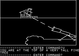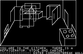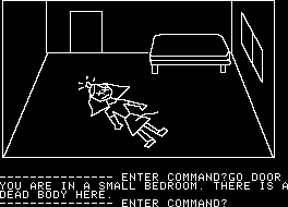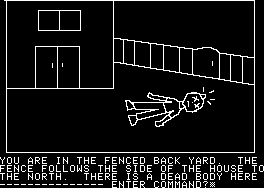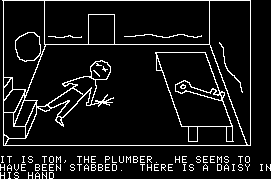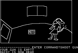 While Mystery House was a true pioneer amongst text adventures, its puzzles, story, writing – pretty much everything, actually – are all quite amateur. There’s not really much in the way of prose so much as stark descriptions. (“You are in the kitchen.”) All of the characters have professions, but none have any personality, nor any real purpose beyond popping up dead. If you pay attention to their bodies you can piece together some clues that implicate the murderer – one was strangled by pantyhose so the killer is probably a girl, and another is holding a daisy, which… well, spells out the killer’s name right there. You can easily kill yourself through stupid means – such as lighting a candle, tripping, setting the house on fire, and not putting it out in time – plus you can get lost in the surrounding forest. And there’s a short time limit at the beginning, where you need to find a light source lest you find yourself wandering in the dark.