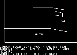 In 1983, a Japanese company called Starcraft ported Mystery House to Japanese computers such as the PC-6001. (There’s another graphic text adventure developed by Microcabin using the same name, although it’s entirely unrelated to Sierra’s game. This means there were two games on the market with the same title – one a shoddy ripoff, the other quite authentic.) While Starcraft’s port is very similar to the original Apple II version, all of the graphics have been redrawn and improved. It still uses the simplistic black and white line drawings, but all of the characters now have vaguely realistic proportions, despite not having any faces, and the visuals look far less rough. Part of this may have had to do with better technology, but the Japanese PCs also ran at a higher resolution than the Apple II, allowing for more screen real estate.