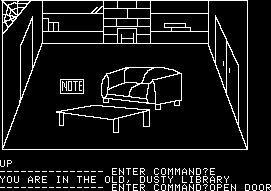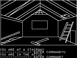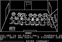 One of the most important adventure games ever made, Mystery House was the first in the genre to add graphics, whereas all previous games were entirely text-based. The visuals are, of course, quite rudimentary, consisting of shakily drawn white lines against a black background. The characters look as if they were lifted from a first grader’s notebook, and even minor items like knives and shovels are crudely drawn. It’s all understandable given the game’s age; it had to fit in the limited RAM of the Apple II, and since there were no real drawing programs on the market, Ken and Roberta Williams had to assemble their own device, combining a graphics tablet with a mechanical arm.